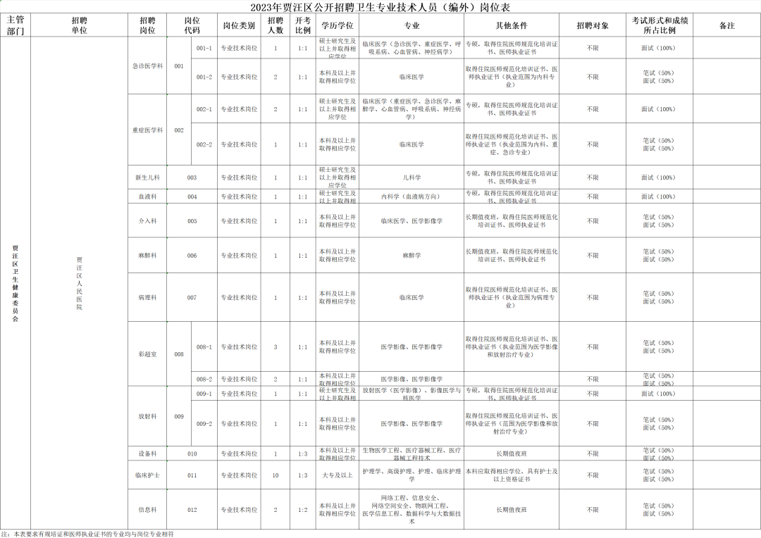 3、具备《2023年贾汪区人民医院公开招聘卫生专业技术人员(编外)岗位表》(以下简称《岗位表》)中岗位要求的学历、专业及资格条件。其中,“专业”条件由招聘单位按《江苏省2023年度考试录用公务员专业参考目录》设置并审核,专业条件中还包括部分未列入专业参考目录但确有院校开设且有招聘单位需要的专业。