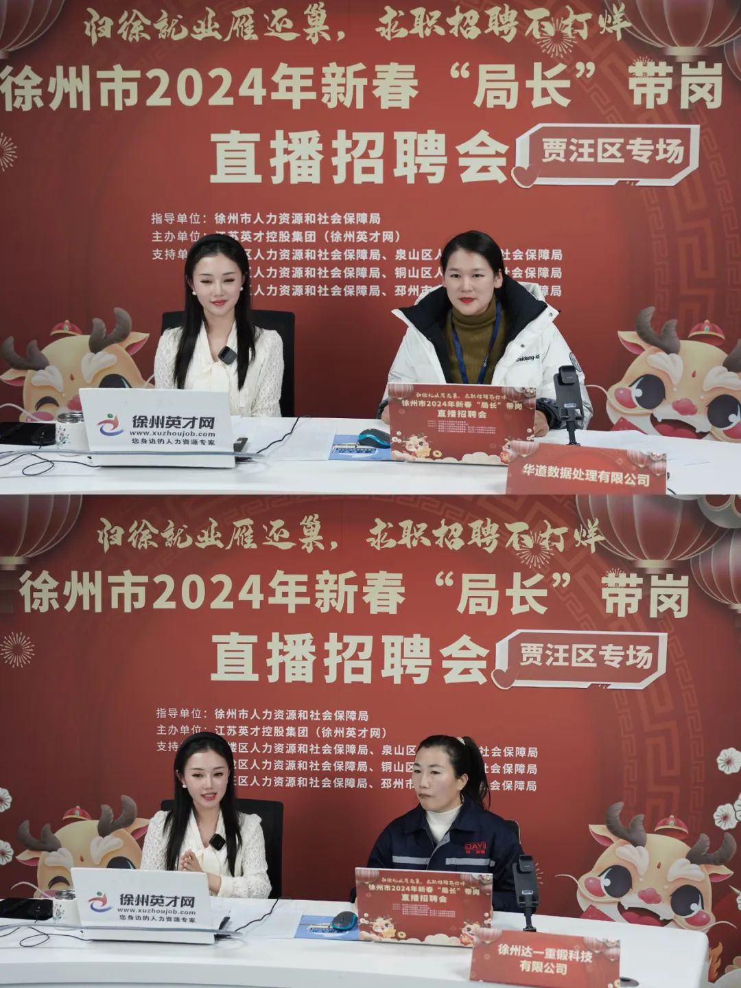 贾汪区专场直播带岗活动,有徐州达一重锻科技有限公司、江苏金致新能源车业有限公司、徐州恒盛智谷科技发展有限公司、华道数据处理(苏州)有限公司4家优质企业的招聘代表亲临直播间解答。